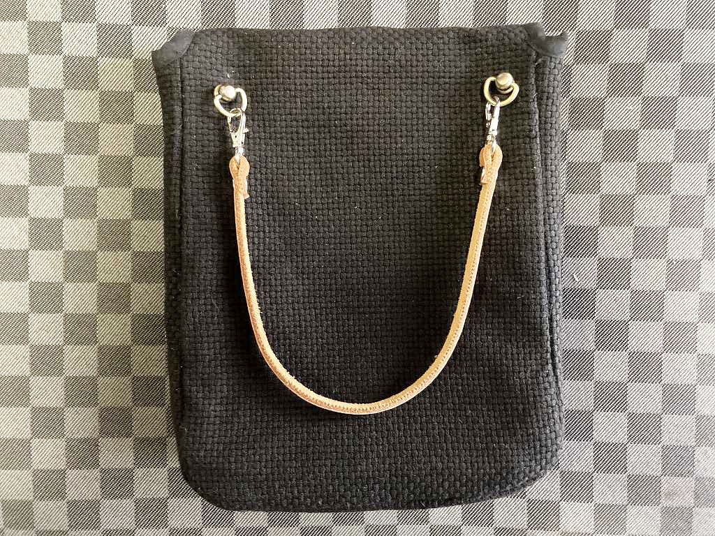 刺子千代掛け(やや縦型)黒は、日本の伝統的な刺子織り生地を使用したポシェットです。